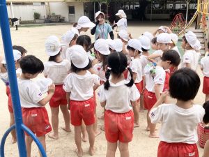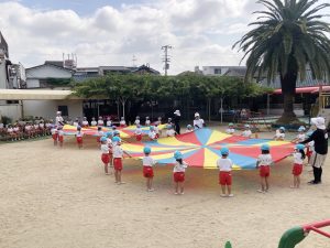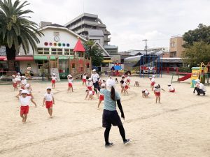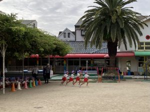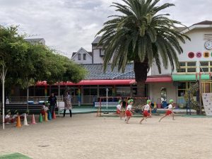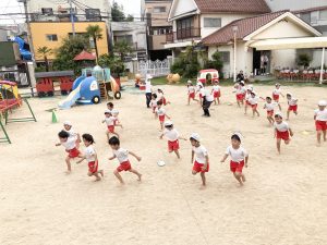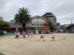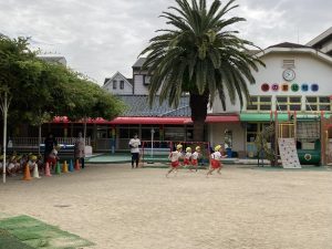年長さんのリレーを見て、先生にリレーごっこをお願いするすみれ組さん(*^^*)