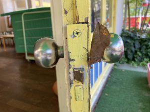 幼稚園の講堂のドアに大きな枯葉が挟まってる・・・??