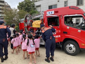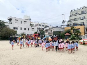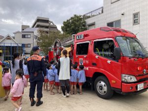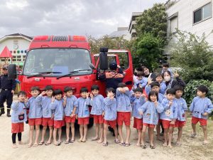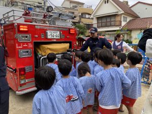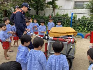 岸の里幼稚園では今日、消防署の皆様と一緒に、地震・消防・避難訓練を実施しました。