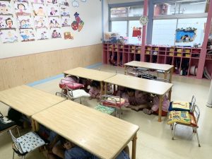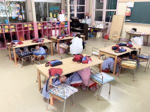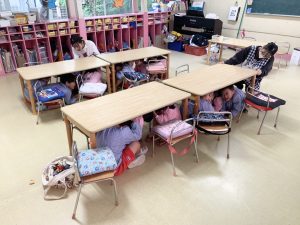 訓練用の緊急地震速報のアナウンスで、机の下に隠れて・・・!