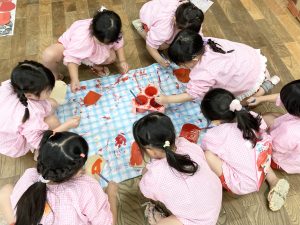 英語と交代で、講堂では作品展の共同制作もしましたよ♪