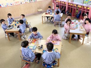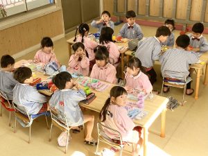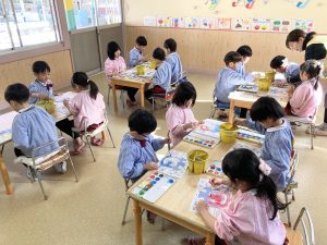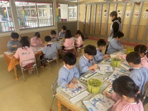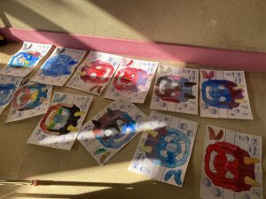 年長組さんは豆まきのお面の製作をしていましたよ♪