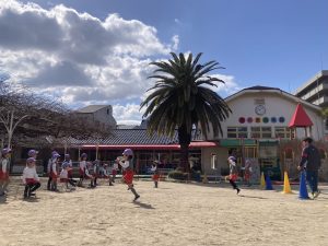 保育室で、年長組さんは2クラス合同で卒園式の練習