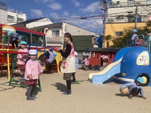 年長組のお兄ちゃん・お姉ちゃんが卒園してなんだかちょっぴり広くなった園庭で、今朝も元気に遊びました!