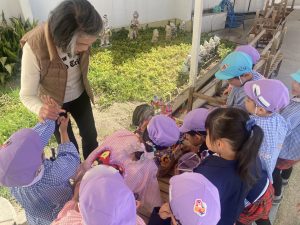 卒園式で保護者の皆様より頂きました、園長先生の花かごに興味津々!