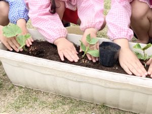 3月にみんなで植えたカボチャの種も、目を出して双葉・本葉が出ています!