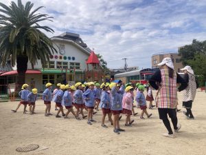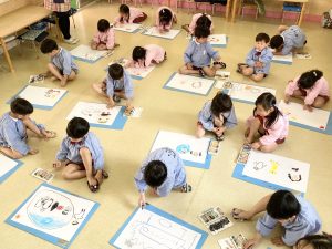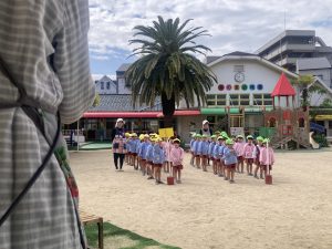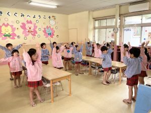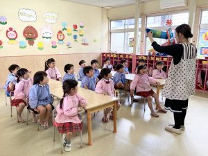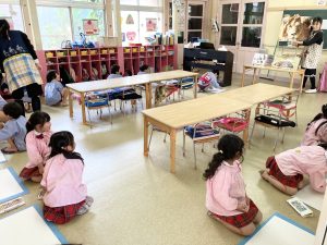 入室して季節のお歌を歌ったり、先生のお話を聞いて・・・